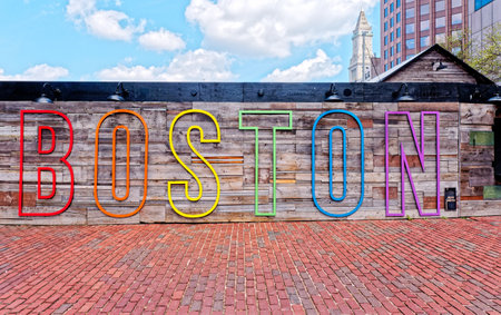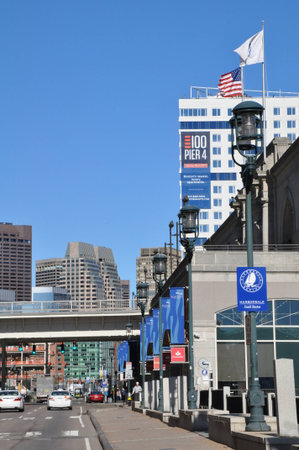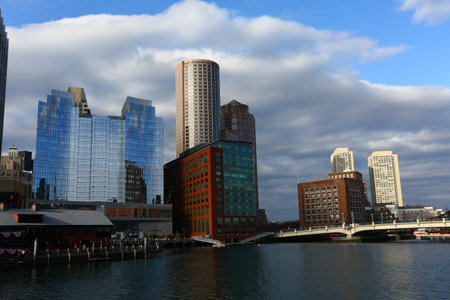 Panoramic picturesque city view of Boston Harbour and Seaport Blvd at day, Massachusetts. An intellectual, technological and political center. Building exteriors of financial downtown.