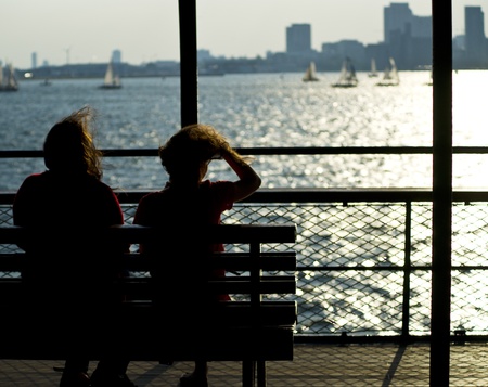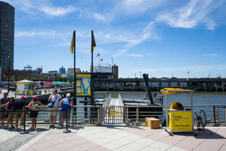 New York City, USA - August 5,2013 people and tourists waiting for a water taxi to the bus stop south of Manhattan on a sunny day
