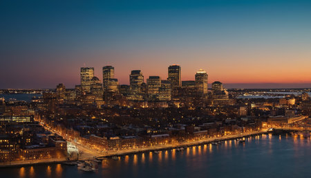 A sprawling Boston cityscape glows with artificial lights at twilight, reflecting on the dark water of the harbor.