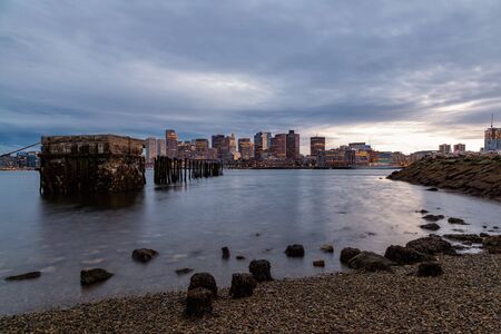 Boston skyline at sunset with purple sky and ocean, Massachusetts, USA