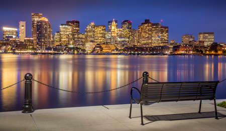 Boston, Massachusetts skyline at sunset with urban skyscrapers and bench.