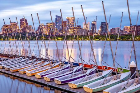 Boston Charles River boats at dusk, Boston, Massachusetts, USA.