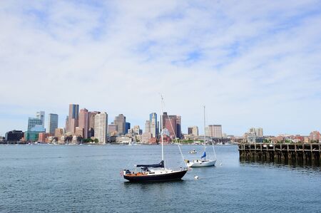 Sailing boat rest with dock in bay and Boston downtown skyline with urban skyscrapers over sea in the morning.
