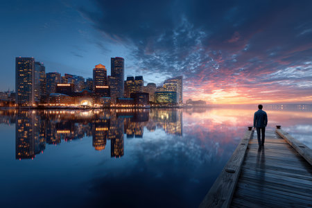 A stunning sunset casts colorful reflections on calm water, showcasing a vibrant urban skyline framed by dramatic clouds and twilight beauty.