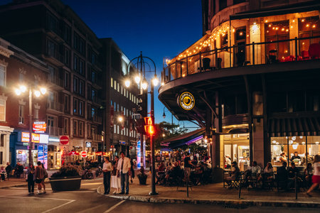 Trois-Rivieres, Canada - August 16, 2025: Evening view of lively Rue des Forges with cafes, lights and pedestrians in downtown Trois-Rivieres