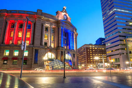 Exterior of the South Station at twilight, in Boston, Massachusetts.