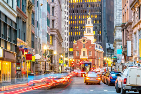 Old State House and the skyscrapers of the Financial District at twilight in Boston, Massachusetts, USA