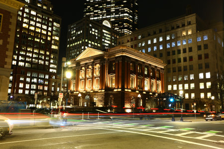 Boston, MA, USA - August 20, 2016: Old State House and the skyscrapers of the Financial District at night in Boston, Massachusetts, USA