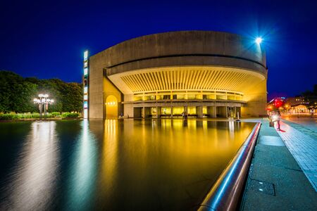 Building and reflecting pool at the Christian Science Plaza at night, in Boston, Massachusetts.