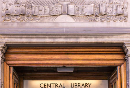 Edinburgh, Scotland, UK - June 13, 2012: Let There Be Light slogan as mural on beige-brown front facade above door entrance of Central Library.