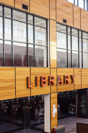 Entrance to middle school library building in Dallas, Texas, with LED Library signage text, modern façade exterior design with interior wooden siding wall backerboard panels, glass windows. USA