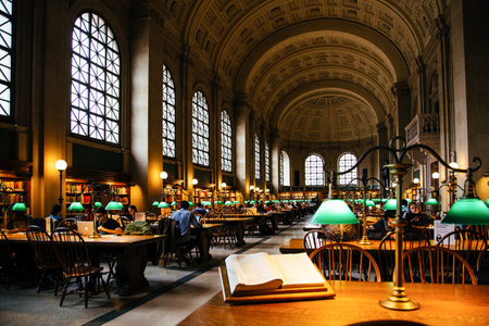 BOSTON, UNITED STATES - Jul 16, 2018: Boston Iconic Public library, the green lamps at the desks with a book well lit in foreground.