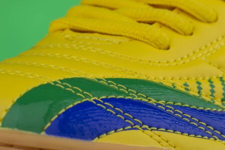 Fragment of a yellow sneaker with blue patch. The texture of the material of sports shoes