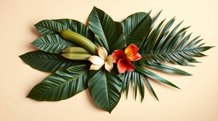 Beautiful tropical leaves and flowers on color background. Flat lay, top view