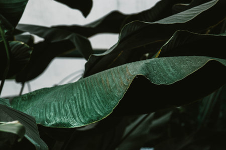 Dark tone of textured surface of Alocasia amazonica green leaf background.