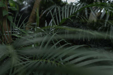 Palm leaves in tropical greenhouse, soft focus. Green plants in natural jungle forest.