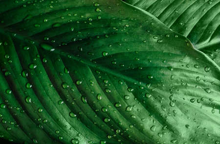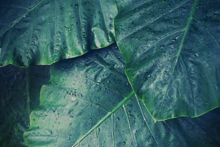 Tropical Green Leaves of Elephant Ear Plant with Raindrops in Dark Tone Color for Background
