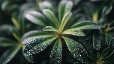 A detailed image displays a plant featuring multiple leaves adorned with sparkling water droplets. The composition uses shallow depth of field, bringing the plant into sharp focus while blurring the background. The lighting is soft and diffused, creating a serene and natural ambiance suitable for various editorial and commercial applications.
