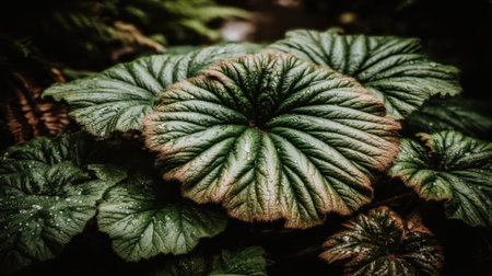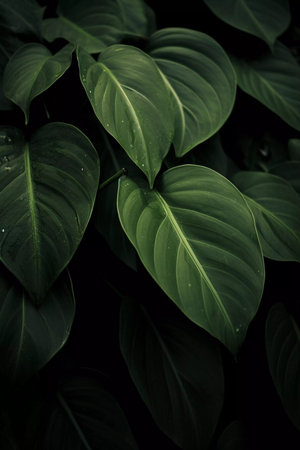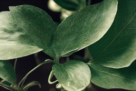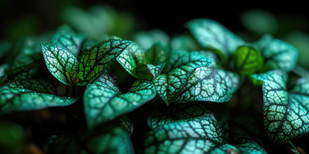Vivid close-up photograph of lush green leaves showcasing detailed textures and patterns, set against a dark, blurred background. ideal for nature-themed designs, botanical illustrations, and environmental awareness campaigns. Generative AI
