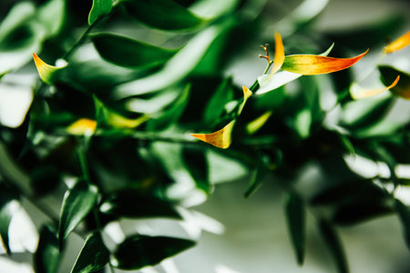 Beautiful fairy dreamy magic red and yellow flowers with dark green leaves, retro vintage style, shabby chic effect, soft selective focus, blurry background, copyspace for text