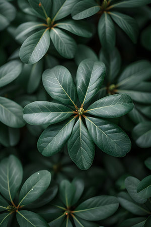 Rich green leaves are displayed in a close-up view, highlighting their smooth texture and vibrant colors under soft lighting, creating an inviting and serene atmosphere.