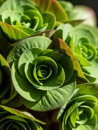 Sunlit green succulent leaves create a tranquil and inviting scene. Vibrant green succulent leaves, highlighted by sunlight in the greenhouse, garden.