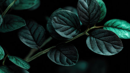 A moody close-up of green leaves against a dark background, highlighting their texture and natural beauty. The image is perfect for themes related to nature, botany, and minimalism.