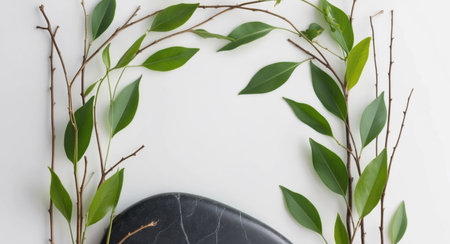 AI Generated. Green Leaves and Twigs Framing a Black Stone Background