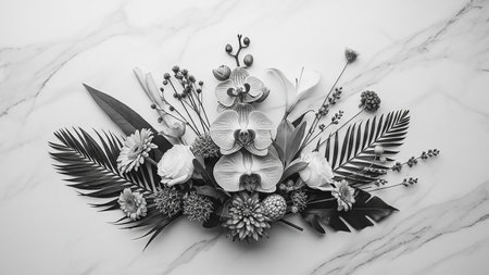 A black and white composition of various flowers and leaves, including orchids and roses, arranged on a textured white marble surface.