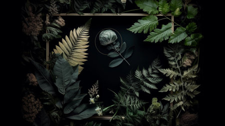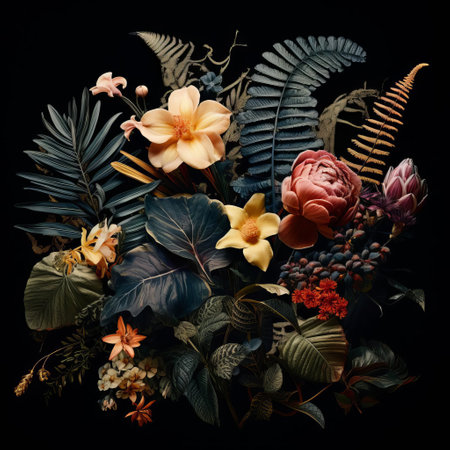 Discover a captivating display of various flowers and leaves beautifully arranged on a dark background, epitomizing the rich beauty of nature and creative inspiration.