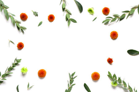 A beautiful display of assorted flowers and leaves presented on a clean white surface, ideal for nature-inspired designs, seasonal themes, or artistic concepts.