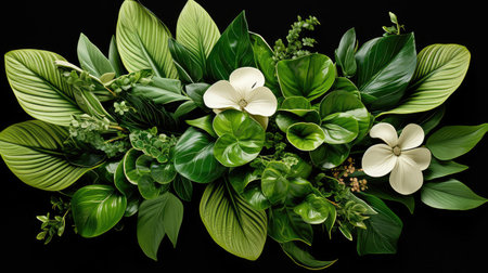 A stunning assortment of fresh leaves, herbs, and flowers artfully arranged on a dark background, perfect for nature enthusiasts and creative projects.