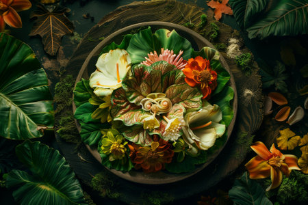This elegant arrangement features various green leaves and colorful flowers, creating a tranquil and artistic representation of nature's beauty. Perfect for design and decoration themes.