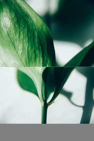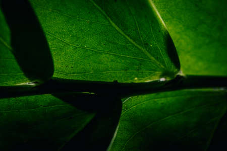Green leaf texture on dark background. Close-up detail of indoor houseplant. Beauty house plant. Indoor plants. Green leaf for home decoration. Wallpaper for spa or mental health and mind therapy.