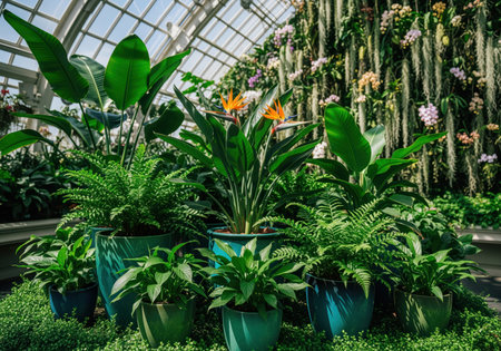 Potted tropical foliage including ferns and bird of paradise plants arranged in glossy teal containers inside a bright glass conservatory. features a lush vertical garden wall in the background, symbolizing growth and botany.