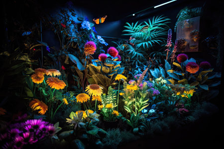 neon plant garden, with blooming flowers and buzzing bees, created with generative ai