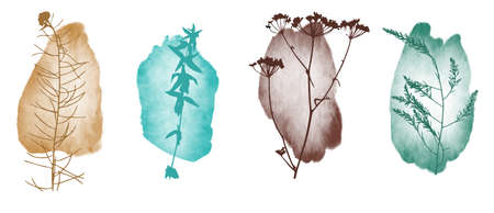 Collection of preserved plant stems, leaves and flowers isolated on white background from a high angle view