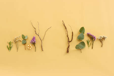 Herbarium of wildflowers with green twigs. View from above. Botanical flower background