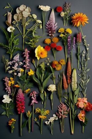 A collection of colorful fresh flowers arranged on a grey background.