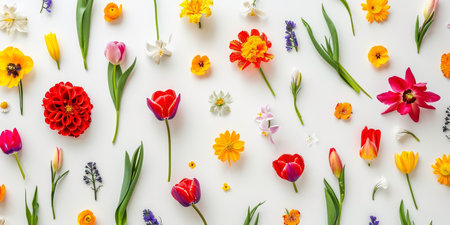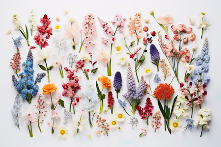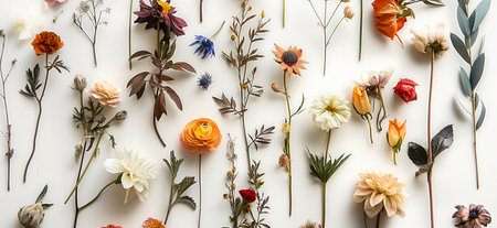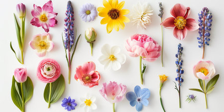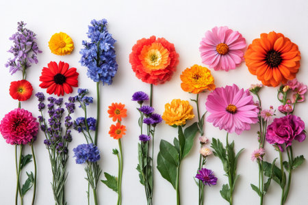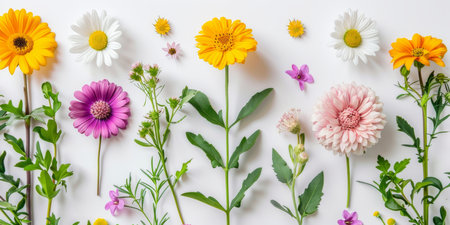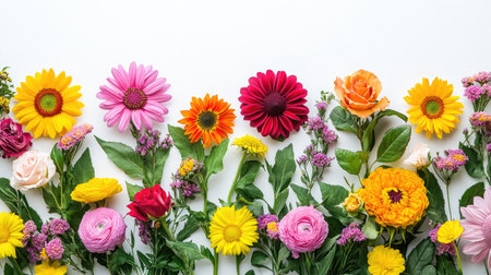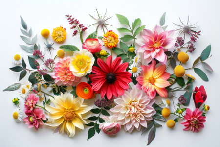 A vibrant collection of fresh flowers arranged artfully on a white background, showcasing a variety of colors and types. Perfect for design projects.