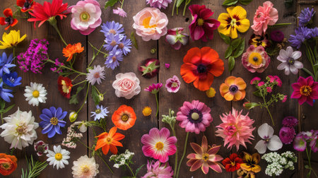 A variety of spring flowers laid out in a random pattern on a polished wooden floor.