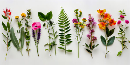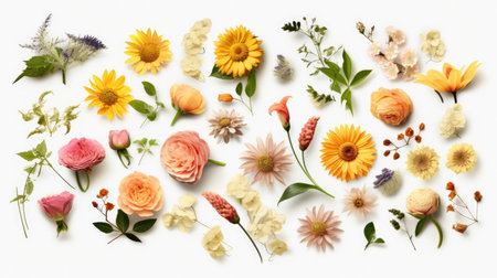 Variety of flowers and leaves in different colors and shapes arranged against a white background