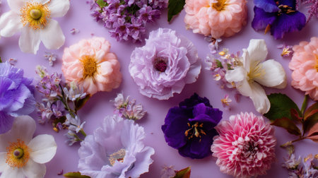 Various flowers are arranged on a purple background. The colors include pink purple white and a mix of blooms. Some flowers are in full bloom while others are smaller.