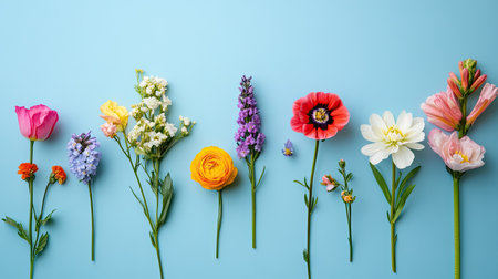 A collection of different flowers displayed on a clean blue background, forming a harmonious and aesthetically pleasing layout perfect for spring-themed visuals.