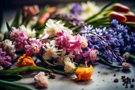 An overhead shot presents a diverse floral arrangement featuring various flower types and petals in vibrant colors. The composition includes multiple blooms with varying textures and shades, with a bright background. This image could be suitable for decorative designs or editorial purposes.