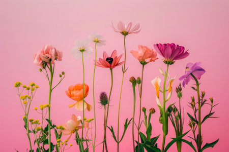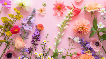 A vibrant display of various fresh flowers arranged beautifully on a soft pink background, ideal for projects focusing on nature, beauty, and creativity.