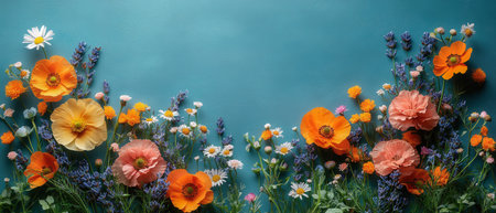 A radiant collection of orange and yellow poppies, white daisies, and lavender sprigs, placed against a bold teal background, symbolizing the vitality of spring