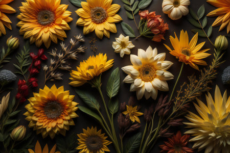 Beautiful autumn flowers on dark background. Flat lay, top view. generative ai