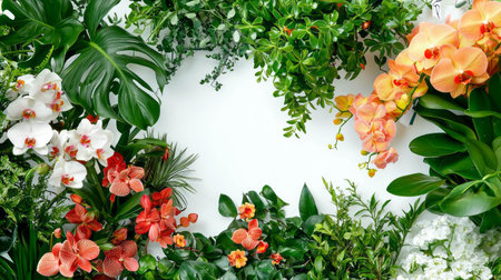 Diverse collection of vibrant tropical foliage and blossoms creatively displayed against a white canvas