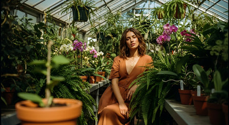 A serene woman surrounded by lush greenery in a beautiful greenhouse